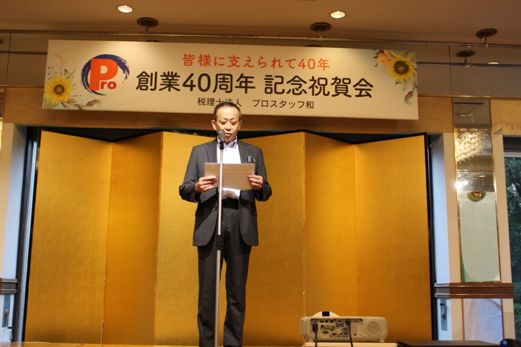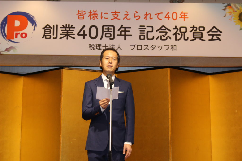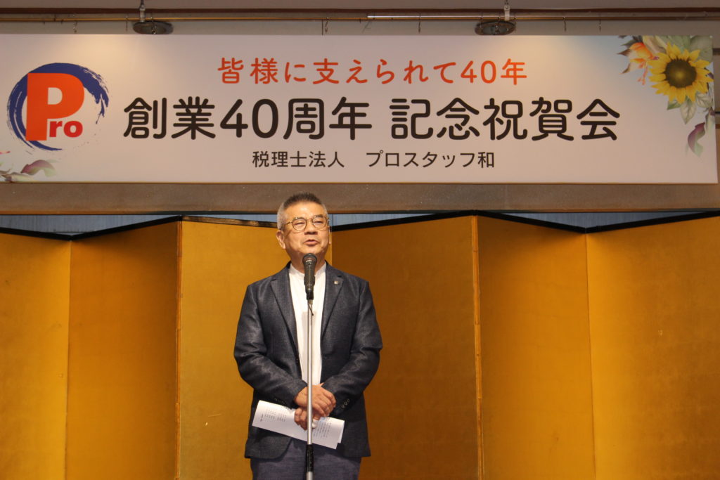 初めに、主催者の代表社員 山田から創業40周年の感謝を皆様に述べさせていただきました。